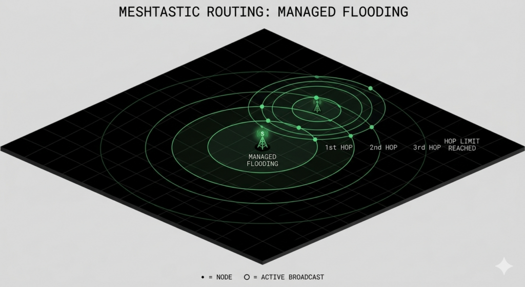 The core limitation of Meshtastic lies in its routing algorithm. Let’s be clear: Meshtastic is not a true network protocol in the traditional sense. It is a broadcast chat application built on a concept called “managed flooding.”
