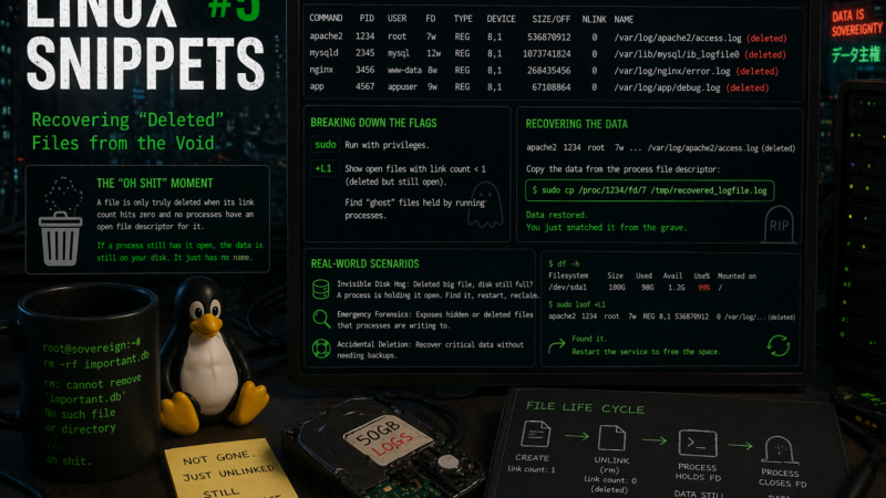 But here is the “hidden gem” of Linux filesystem architecture: a file is only truly deleted when its link count hits zero and no processes have an open file descriptor for it. If a process (like a web server or a database engine) still has that file open, the data is still sitting on your disk. It just doesn’t have a name in the directory tree anymore.