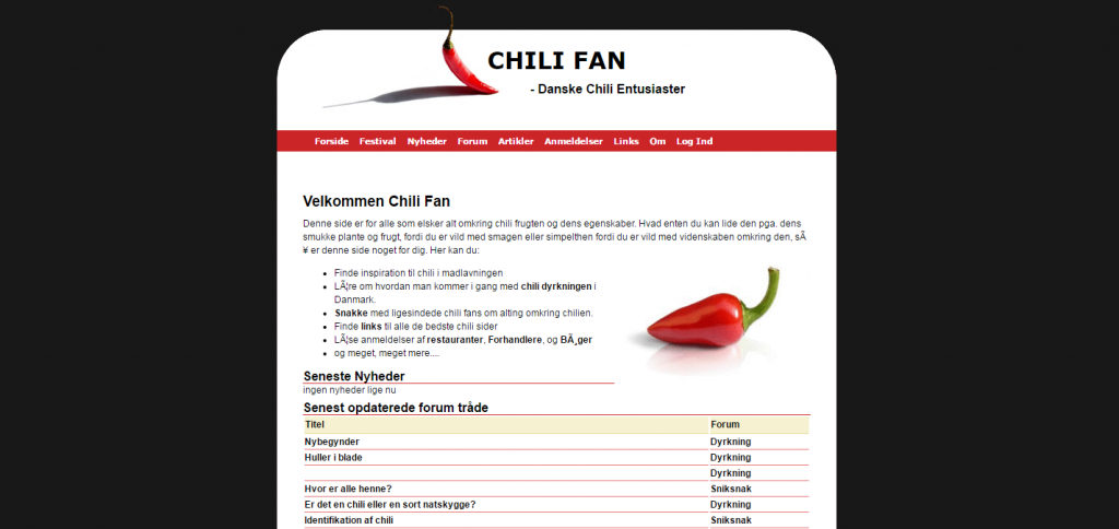 A web community for chili pepper enthusiasts in Denmark. More than 5000 active users when it was most active. Today the activity has moved to a related Facebook Group, after the page was lost in a server crash