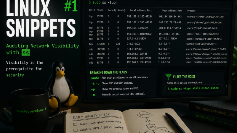 Your Linux system is constantly initiating connections in the background. Learn how to use the modern ss command to instantly audit active network sockets, expose chatty processes, and take back control of your data sovereignty.