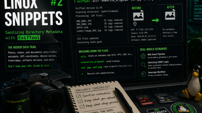 Blindly uploading images to the web is a massive privacy leak. Here is how to use exiftool to recursively strip hidden GPS and hardware metadata from your staging directories before they ever leave your disk.